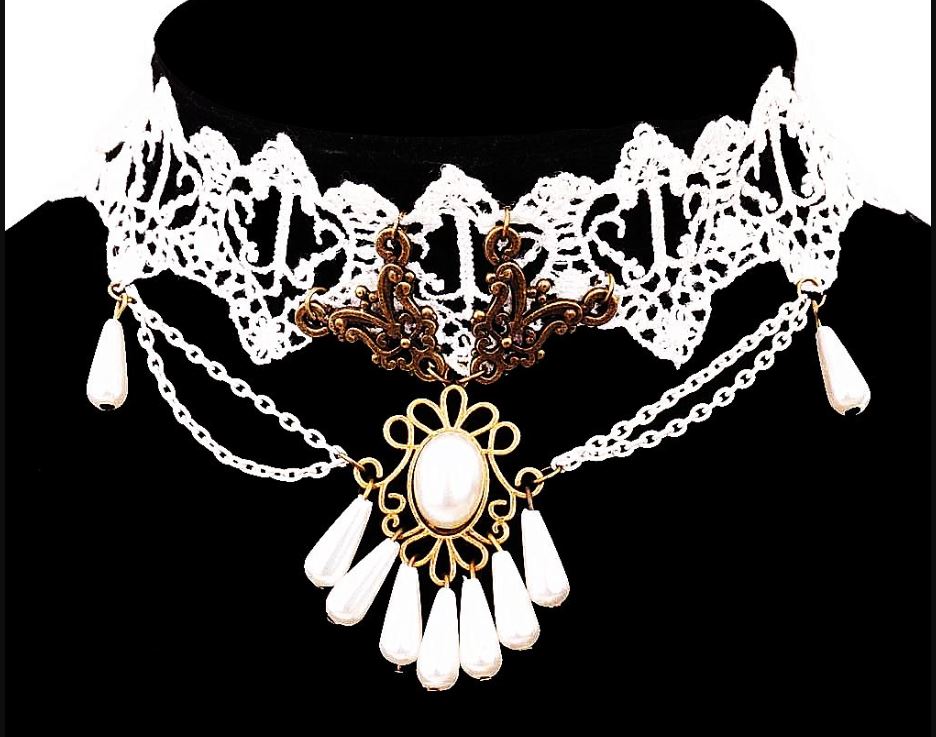 This elegant cameo choker, is perfect for a night on the town. Bronze imitation metal. Lace. Beads.