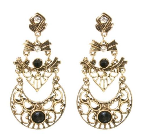 Antique Burnished Gold Metal Drop Earrings with Rhinestone Detailing. Earrings measure 1.5 inches wide, 3 inches long.