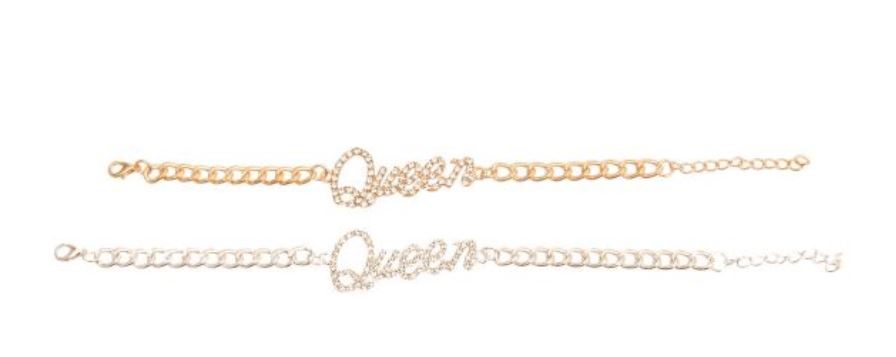 Adjustable chain link high quality metal bracelet, with clear rhinestones available in silver and gold. Queen (2 inches)