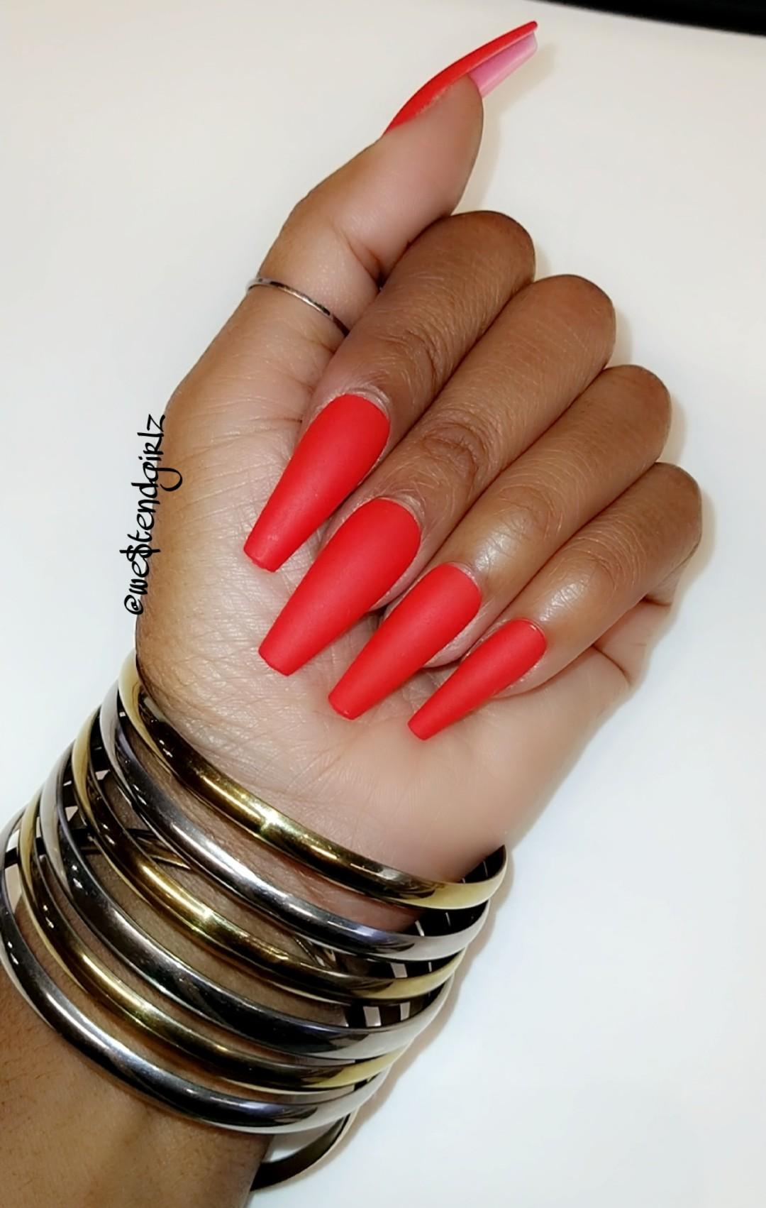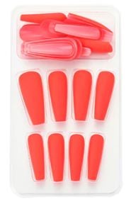 24 matte neon red coffin shaped nails. Nail glue included. So sexy, and so fresh.
