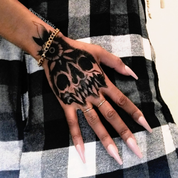 Model wearing our three day temporary tattoo with our press on nail set, Strip.